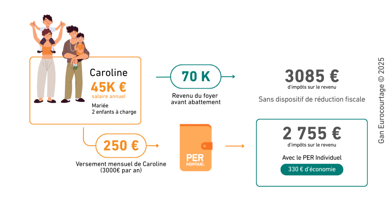 Prenons un exemple pour comprendre : Caroline, salariée, 42 ans, mariée avec 2 enfants à charge. Avec son mari, ils déclarent 70 000 € par an. Son entreprise a ouvert un PERO. Sans dispositif de réduction fiscale, le couple doit payer 3 085 €* d’impôts sur le revenu. Caroline choisit de verser 250 € par mois sur son PERO (soit 3 000 € par an). Le montant de leur impôt passe à 2 755 €, soit une économie de 330 €.